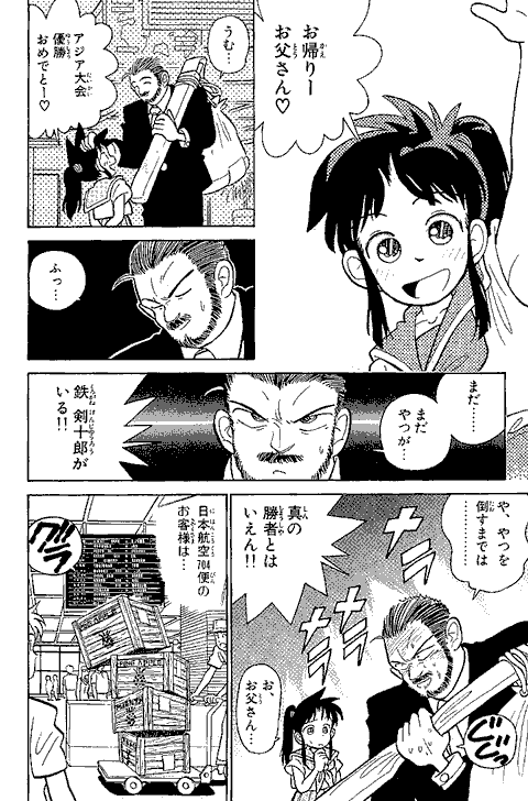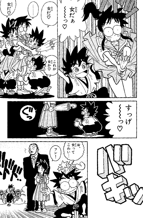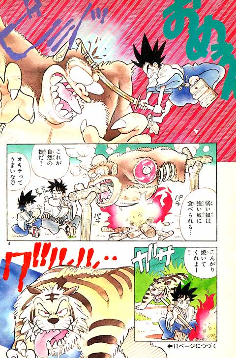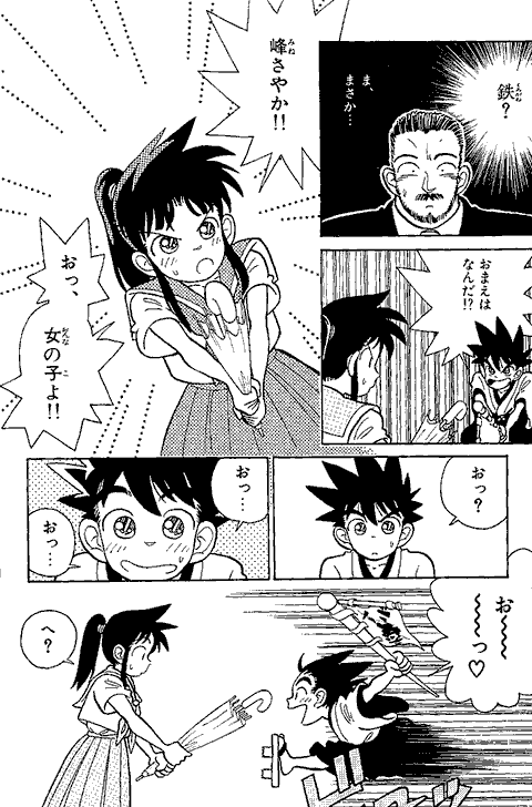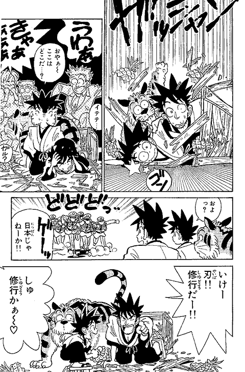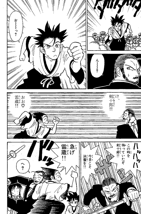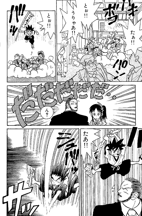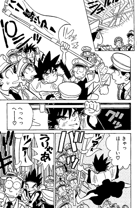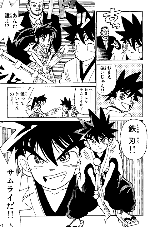 最初に「アニメやゲーム向きの話を…」と担当編集に言われ、YAIBAの1話目は動きがあってノリがいい始まり方にしようと思ったなぁ~… 『まじっく快斗』の頃、アンケートで低年齢層に人気がなくて、担当編集に「おめぇーのまんがは子供に受けねぇからなぁ~」と言われ… カチンと来て「よっしゃ! 子供のハートをつかんでやるぜ!」とギャグとアクション満載にしてたら、子供にしか受けなくなってしまった…(笑)