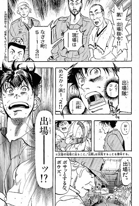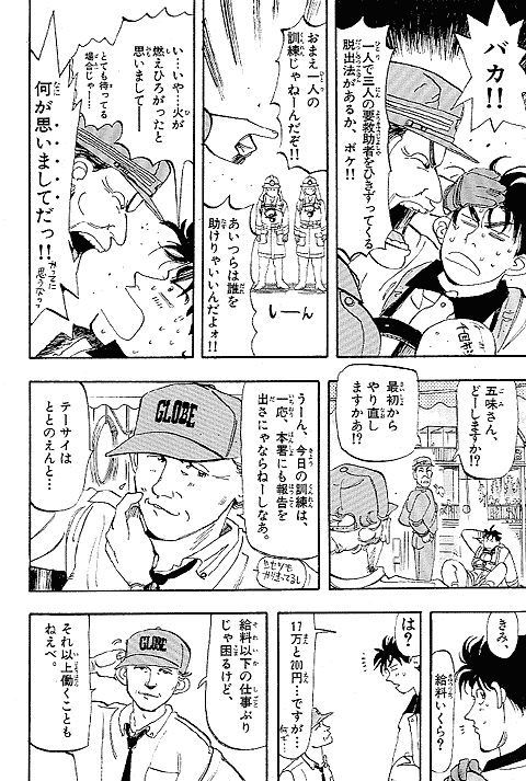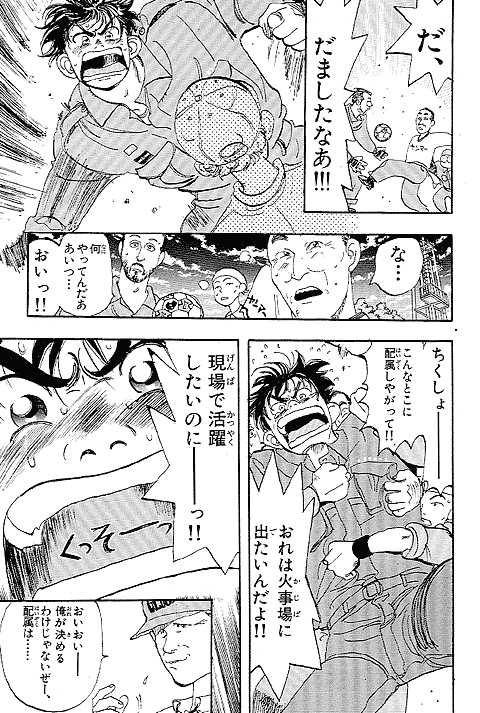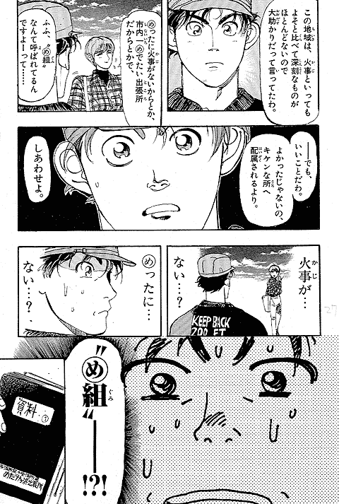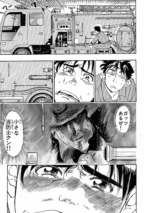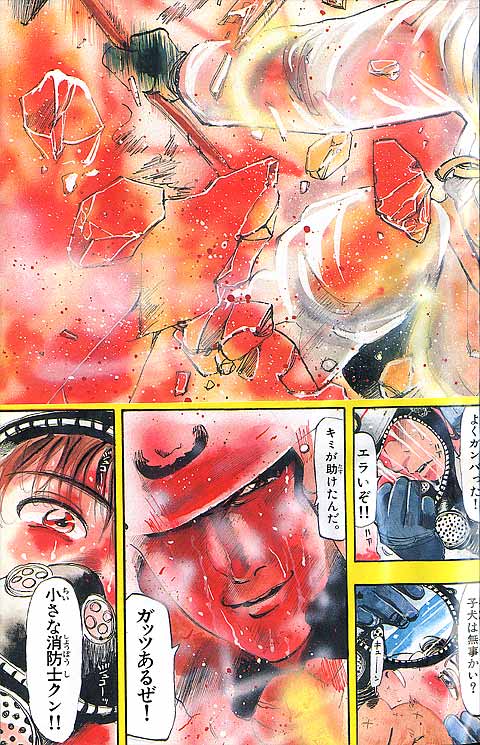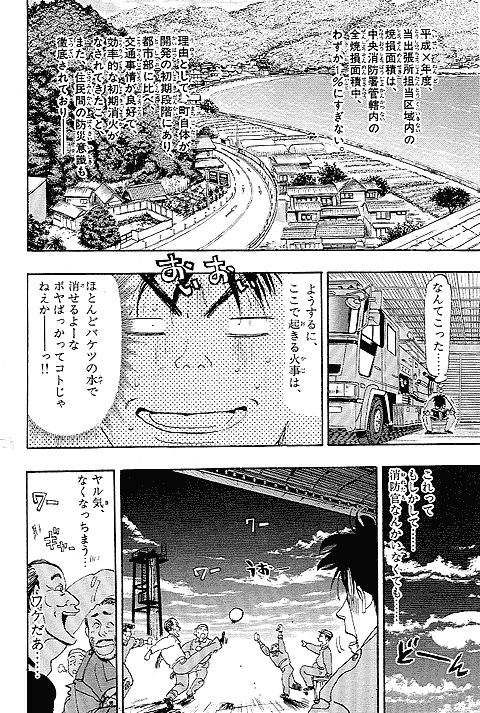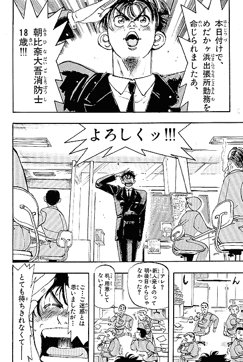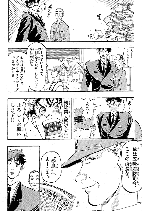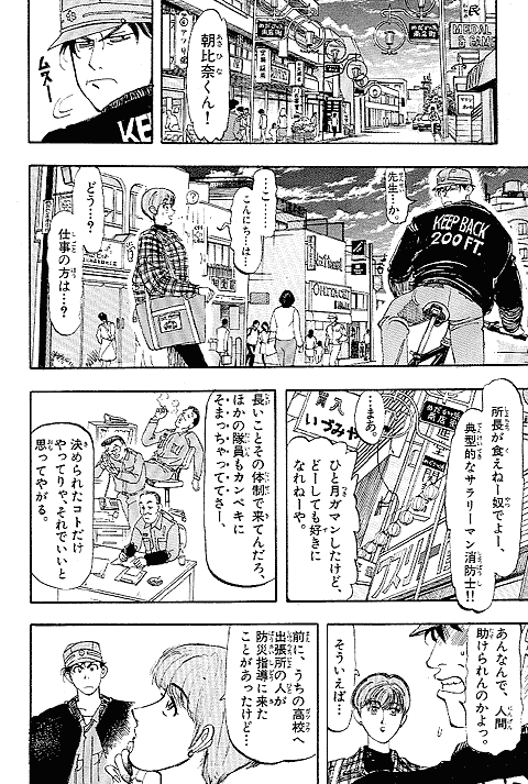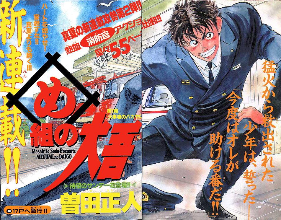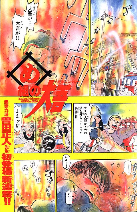幼いころに火事に遭い、消防士に助けられた経験を持つ朝比奈大吾。彼にとってのヒーローは消防官! 18歳になった大吾は、新米消防官として通称"め組"、メダカヶ浜出張所に配属されるが、火事の少なさと先輩たちのやる気のなさにガッカリ。しかし、いざ出動の時がくると…!? 使命に燃えた消防官、大吾の活躍が始まります! 曽田先生の熱血消防ストーリー『め組の大吾』、少年サンデー連載第1回目は、迫力の巻頭カラーでした。当時の雑誌のカラーページを含め、たっぷり34ページ分をお楽しみください。